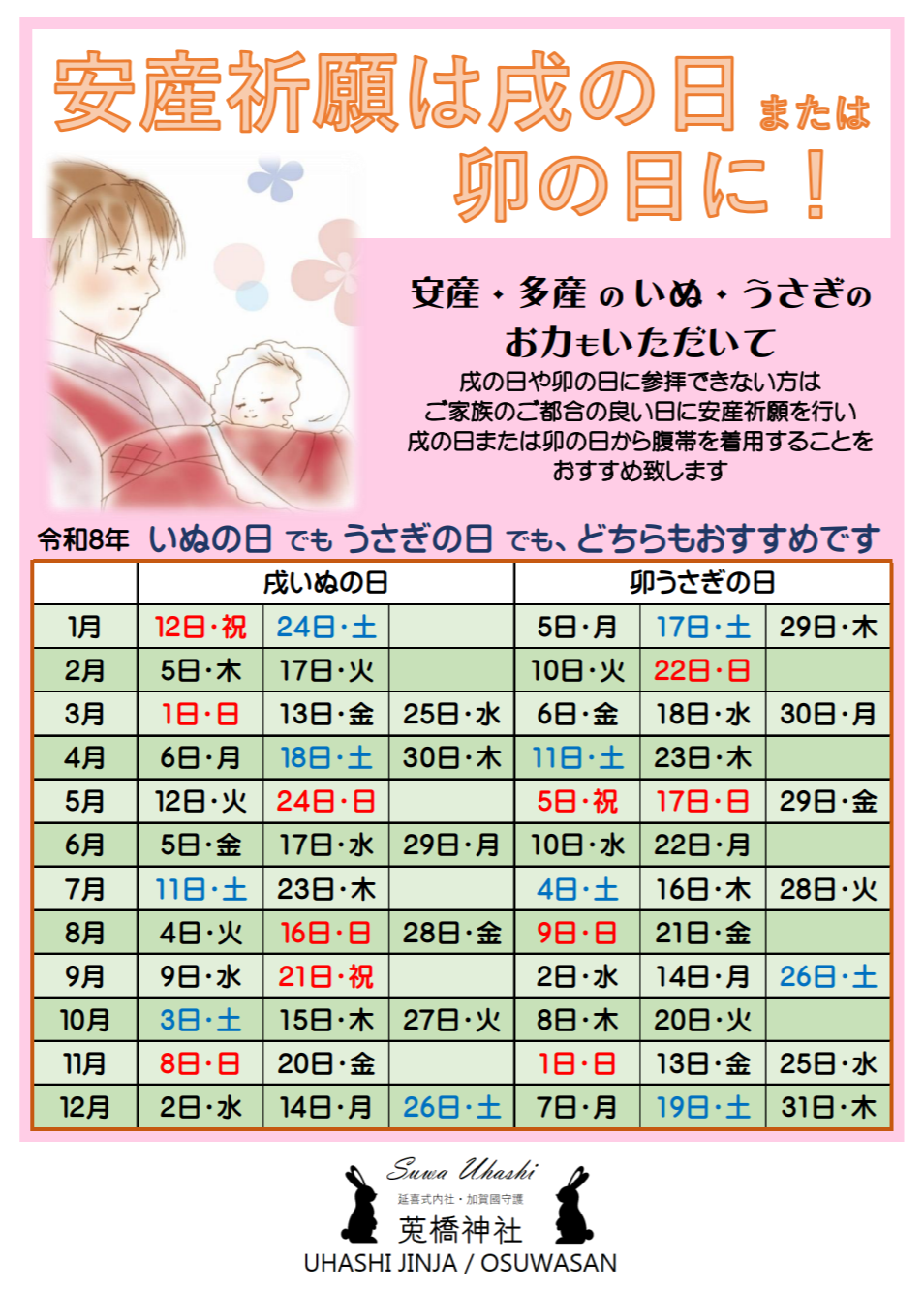 古来より、妊娠5ヶ月の「戌の日」に腹帯をまき安産を祈る風習があります。「戌の日」を選ぶのはお産が軽い犬にあやかってのことです。同じく「うさぎ」も安産多産であるため、当社では「卯の日」も「戌の日」と同様に安産にとって大切な日となっています